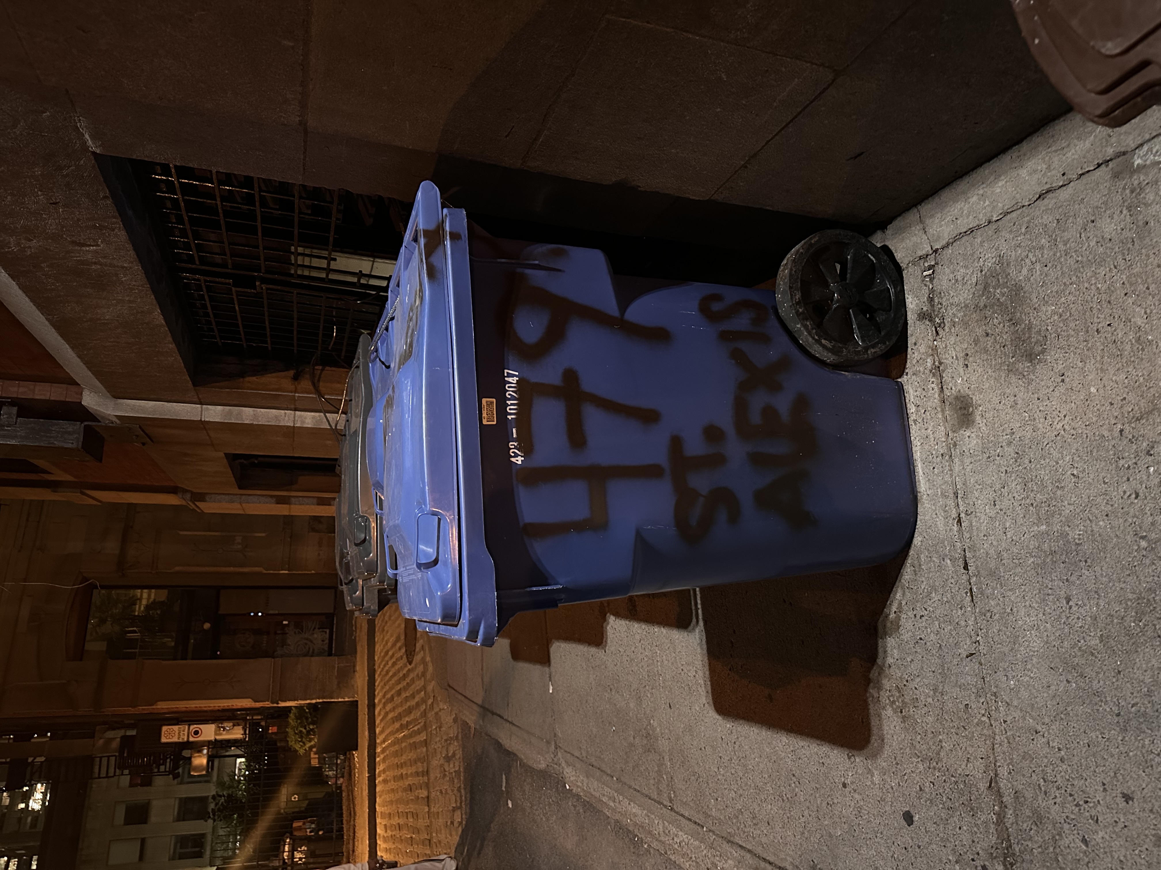 Potential example of tenant graffiti in Montreal. Cross-posted in Landlord Graffiti because it is also possible that the owner/building manager did this. Since no other bins had spray paint on them, it is assumed that the city did not do this officially.